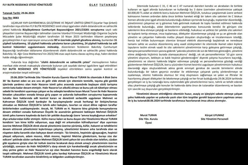 ‘’Sitemizde bulunan daireleri kendisi ve akrabaları ile birlikte kullanan ve işgali altında bulunduran ve kullandığı bu 3 daire üzerinden yönetimimize yaklaşık 60 bin TL aidat ve elektrik borcu bulunan Mehmet ÖZÇELİK, tutuksuz yargılanmak üzere serbest kalmasının hemen ardından daha önce birlikte hareket ettiği bir takım site sakinleri ile C bloğun hemen altında yine işgali altında bulundurduğu dükkan içerisinde buluştuğu, toplantılar düzenlediği, yönetimimizi çalışamaz ve iş göremez hale getirmek maksadı ile toplu hareket edilmesi hakkında telkinlerde bulunduğu, aidat ödemelerinin yapılmaması konusunda kendisi ile görüşen site sakinlerini ikna etmeye çalıştığı ve bazılarını etkilediği, hukuksuz ve yetkisiz bir şekilde site sakinleri ile toplantı tertip etmeye, imza toplamaya, dilekçeler düzenlemeye çalıştığı ve şu an görevde olan yönetim ve çalışanları hakkında matbu şikayet dosyaları oluşturduğu ve imzalanmasını istediği, danışma personellerimizin yanına giderek ‘yakında yönetimi de sizi de Metris'te göreceğim, yönetimi elime aldığımda hiçbiriniz burada olamayacaksınız’’